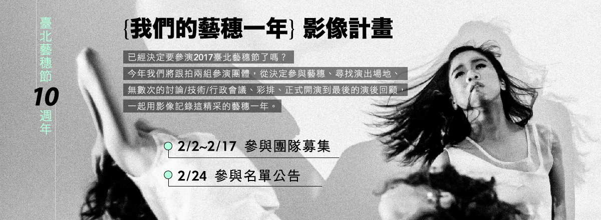 2017年臺北藝穗節即將迎向10週年,在過去的9年間,有990組團隊帶來風格與態度各異的演出,也有無數熱情的志工和觀眾們登上藝穗列車,一同經歷高低起伏的夏日冒險旅程。為了好好的記錄這難得不易的藝穗十年,有些特別的計畫將在今年發生:「我們的藝穗一年」團隊影像記錄計劃,將跟拍兩組表演團隊參與2017臺北藝穗節演出的點滴足跡;策劃小組也著手編輯藝穗十年的專刊出版,評論觀察文章、歷年記事以及精彩劇照都將收錄其中。
